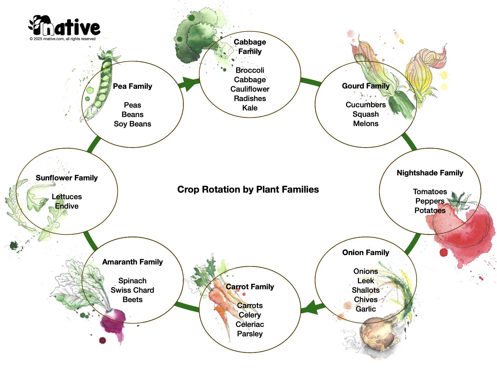 Cucurbitaceae (Gourd family): Cucumbers, squash, melons. Example: Squash planted one year can be rotated with potatoes (Solanaceae family) the next.