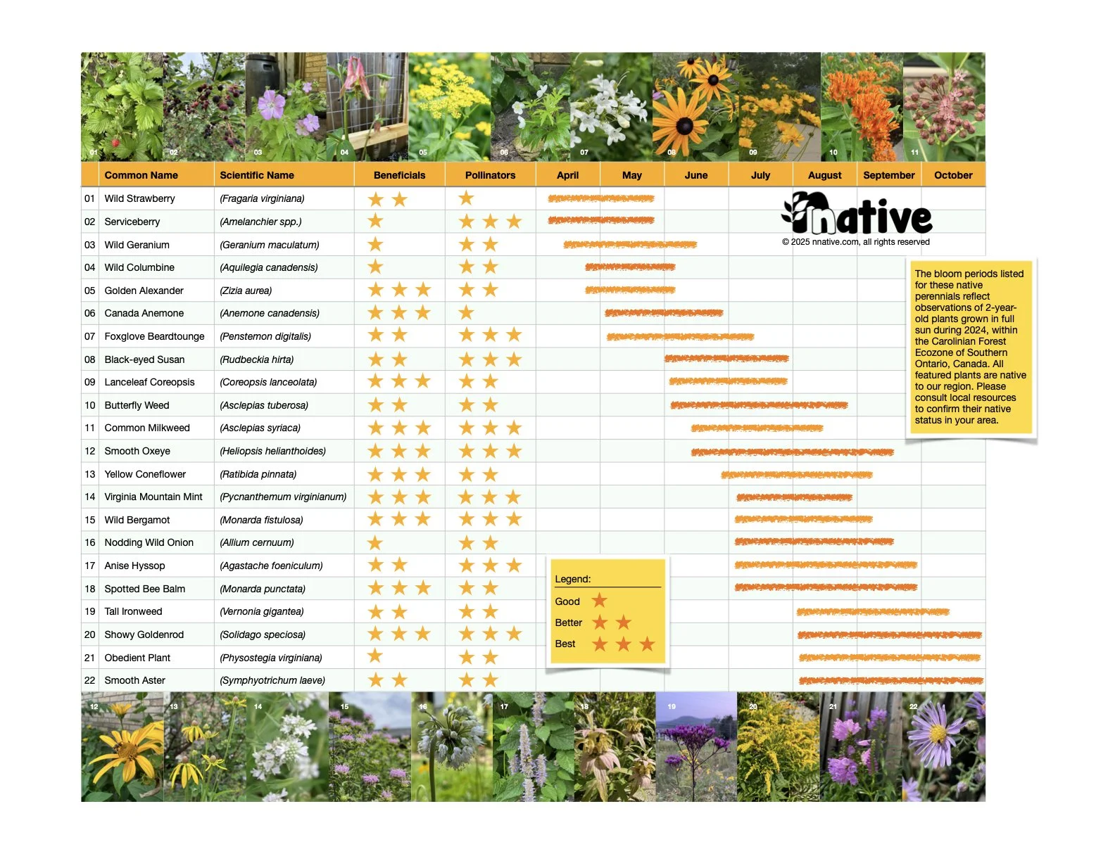 The bloom periods listed below for these native perennials are based on observations of 2-year-old plants grown in full sun during 2024, within the Carolinian Forest Ecozone of Southern Ontario, Canada. All featured plants are native to our region. However, we recommend consulting local resources to confirm their native status in your area and adjust your plant choices accordingly.