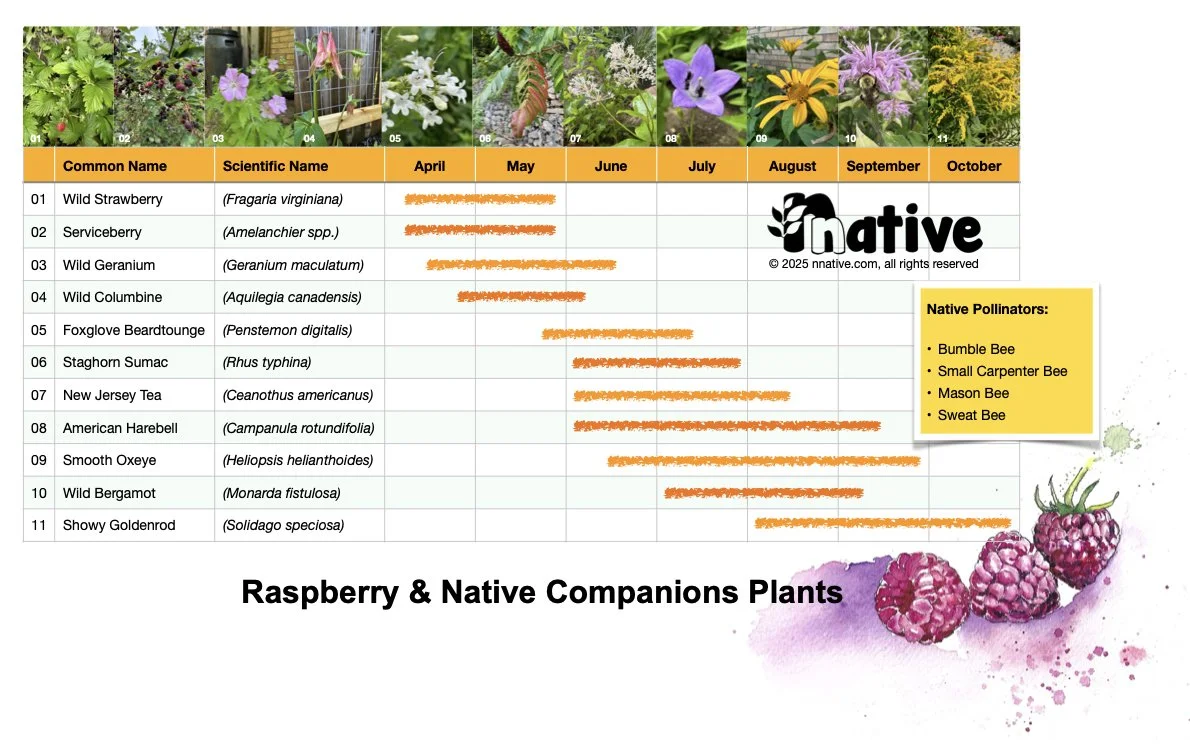 By focusing on a single plant and its companions, we can gain a deeper understanding of the concept of companion planting. Choosing plants that bloom continuously throughout the season ensures a steady presence of pollinators in the area. Everbearing raspberries, for instance, bloom twice a year—once in late spring and again from late summer to fall, continuing until the first frost. During periods when the raspberries are not flowering, it is crucial to provide alternative native blooms to support local pollinators. Native flowers that bloom in April, June, and July play a vital role in sustaining these pollinators, bridging the gaps in food availability.