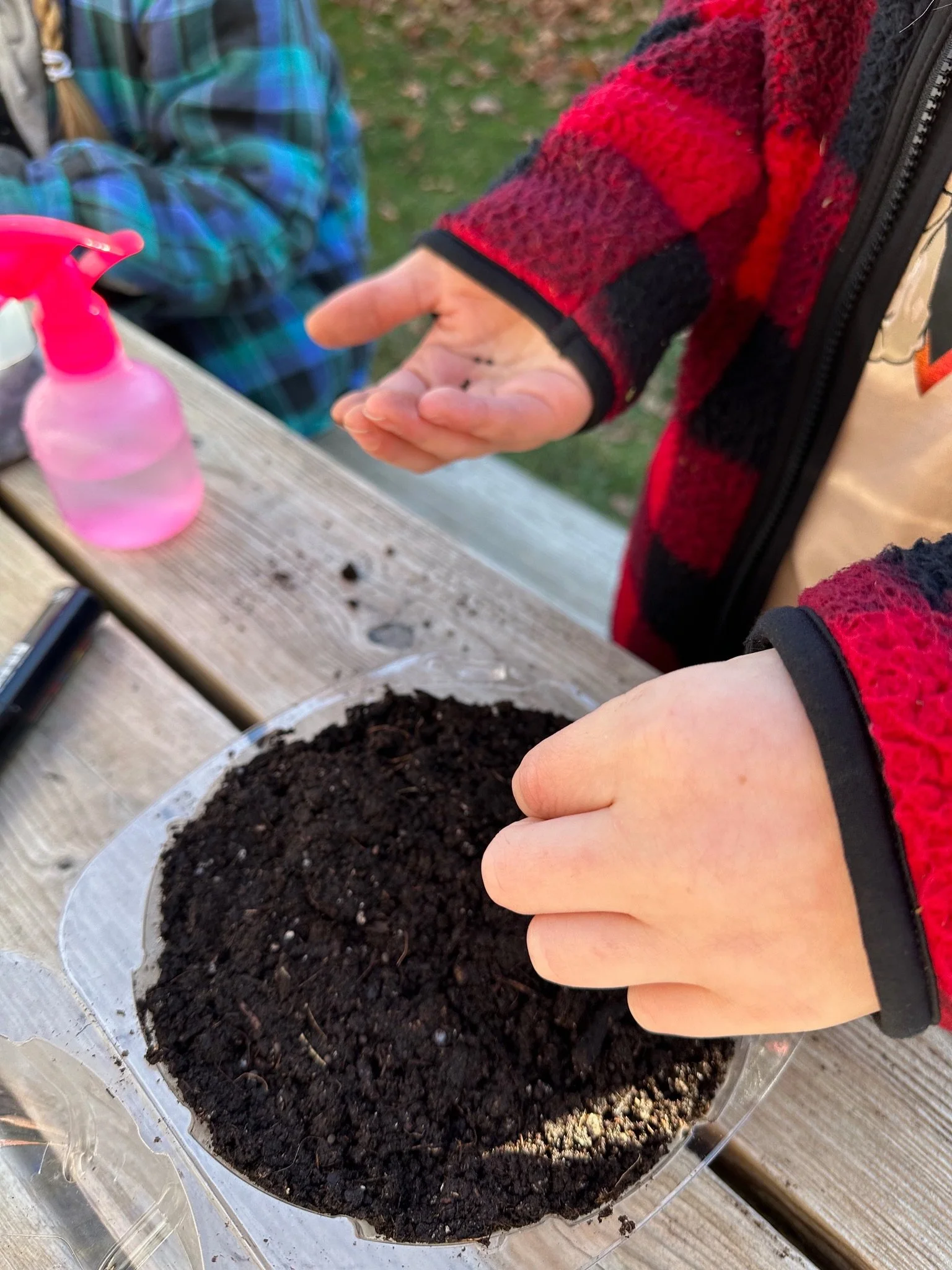 If the containers you’re using don’t have lids, you’ll need to cut them in half. Be sure to cut high enough to leave at least 3–4 inches of space for soil. We recommend cutting most of the way around the container but leaving a small section attached to act as a hinge. This makes it much easier to tape the pieces back together later.